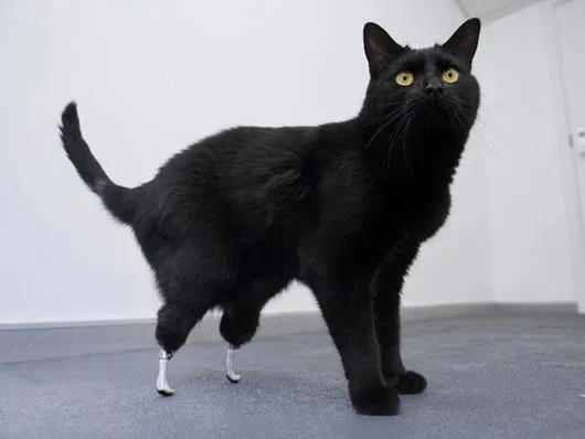 A cat that had its back feet severed by a combine harvester has been given two prosthetic limbs in a pioneering operation by a UK vet. The custom-made implants that "peg" the ankle to the foot are bio-engineered to mimic the way deer antler bone grows through the skin.