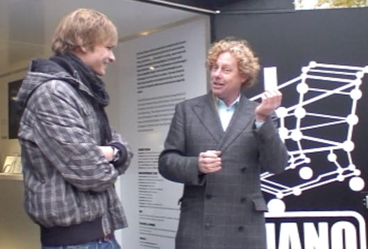 Jury chair Ronald van Tienhoven hands out a 2500 euro 'nano' check to designer Nicolas Nelson (read the jury report).