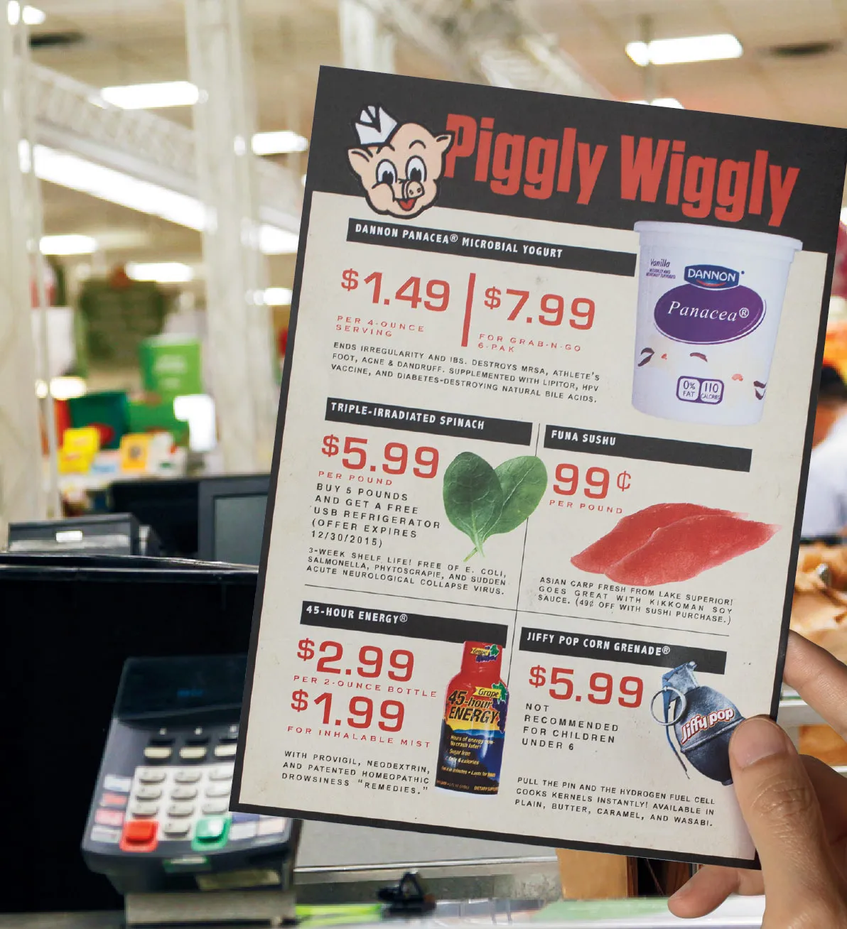 A panacea Yoghurt? Cures athlete’s foot, acne and dandruff! Triple irradiated Spinach? Three-week shelf life! Funa sushu? Asian carp fresh from Lake Superior! Minority Report sequel? Fake or Real? Neither. It’s futuristic shopping as seen through the eyes of Wired magazine readers.