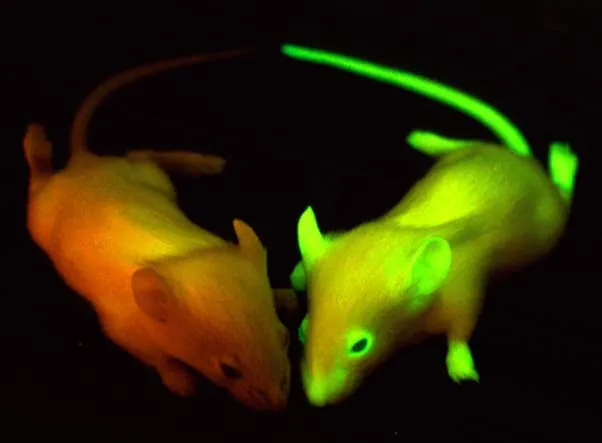 In just a fragment of evolutionary time, today's ‘to die for’ bio-couture has been genetically spliced with jellyfish signatures. These trophies are freer to roam and easier to find than their miniaturised predecessors, as they can glow under UV, or ‘black’ light. Although not all varieties can fit in a clutch purse yet, there is an impressive range of designer ‘glo’ organisms available in green and red (blue is possible but isn’t as impressive under UV light). Options include fruit flies, fish, mice, chickens, rabbits, pigs and cats (for glo-cats, see here, here and here).