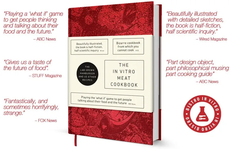 The cookbook features 45 lab grown meat recipes that might be on your plate one day. Meat paint, revived dodo wings, meat ice cream, cannibal snacks, steaks knitted like scarves and see-through sushi grown under perfectly controlled conditions. Though you can’t cook the recipes just yet, they've all been developed with strict culinary rigor. Because, before we can decide if we will ever be willing to eat meat from the lab, we need to explore the food culture it will bring us.