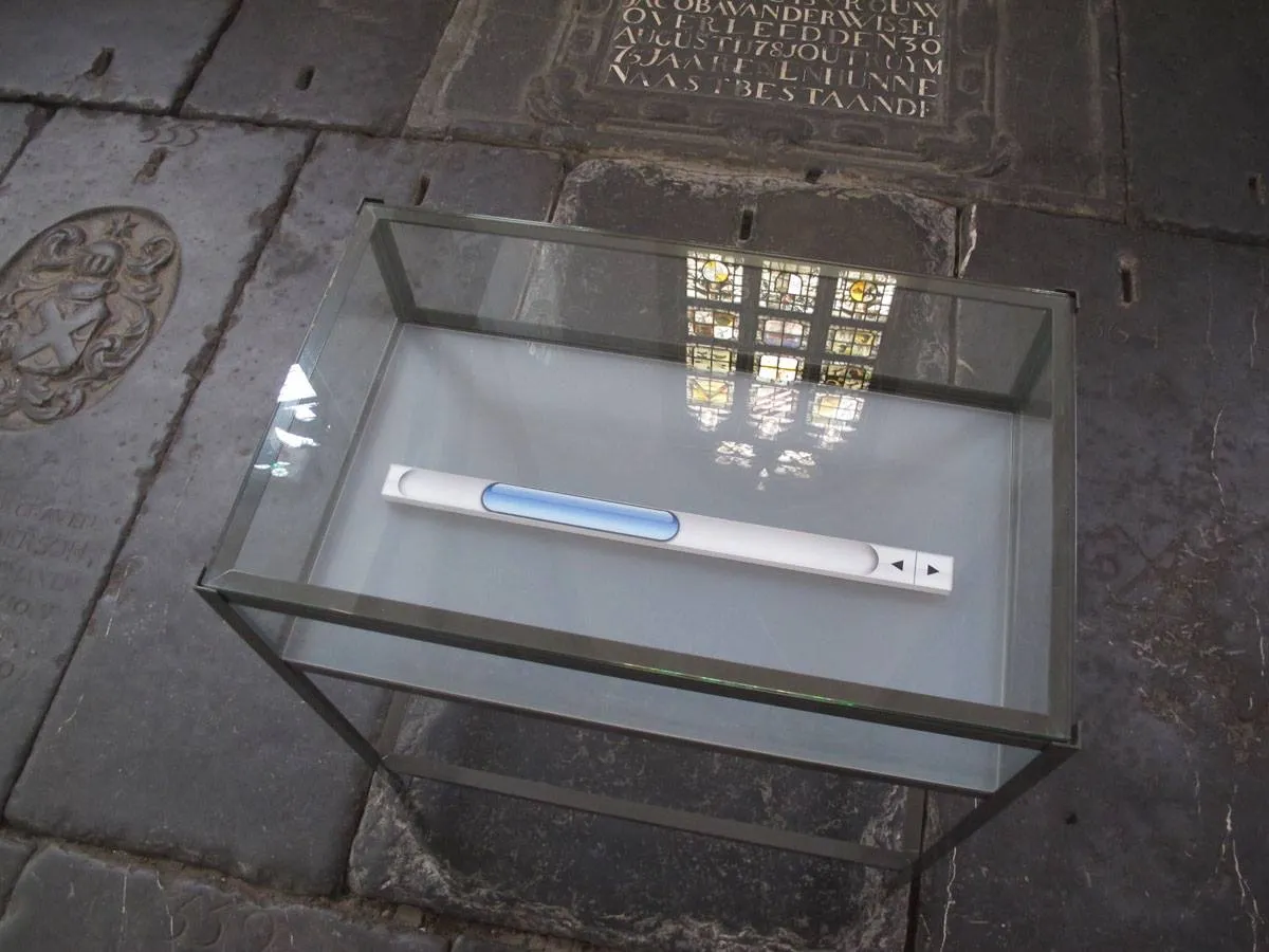 Our peculiar image of the week is a new work by Jan Robert Leegte celebrating the long gone Apple scrollbar. This physical incarnation of a deceased scrollbar is currently on display in the Main Church in Haarlem, Netherlands.