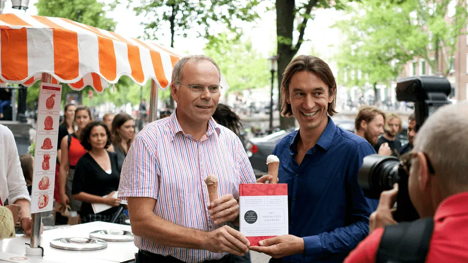Hooray! Our In Vitro Meat Cookbook is now officially available. At the launch event creative director Dr. Koert van Mensvoort, handed the first copy out to Prof. Mark Post, who exactly one year ago presented the World's first lab grown hamburger.