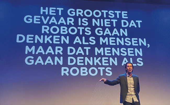 During the afternoon has been focused on getting inspiration to design the office of the future. To discard our robot fear, philosopher and professor Jos de Mul explained how we can learn from robot-loving countries like Japan. The working environment of the future got organized by researcher and entrepreneur Saskia Nijs, who pointed out topics such as shortening working hours and stimulating employees to uplift their personal qualities. Then, the office has been redesigned by artistGovert Flint, with the aim to create a place able to stimulate all our senses.