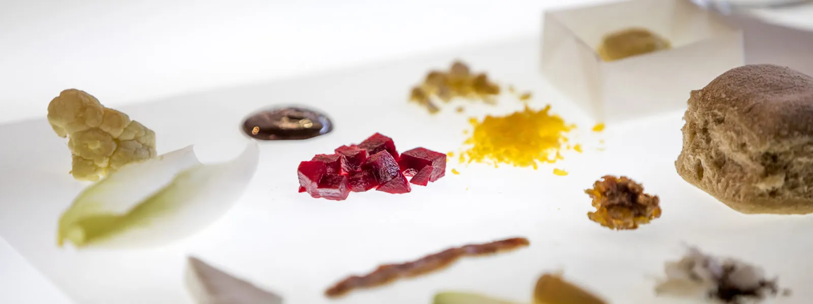 On the tables there are white pyramid-shaped cloches that cover the first course, this is the dish we will review today. Once the cloches are removed by Watson's “physical assistants”, we see 18 ingredients laying in a grid on our plate, ranging from a potato chip to a candy cane.