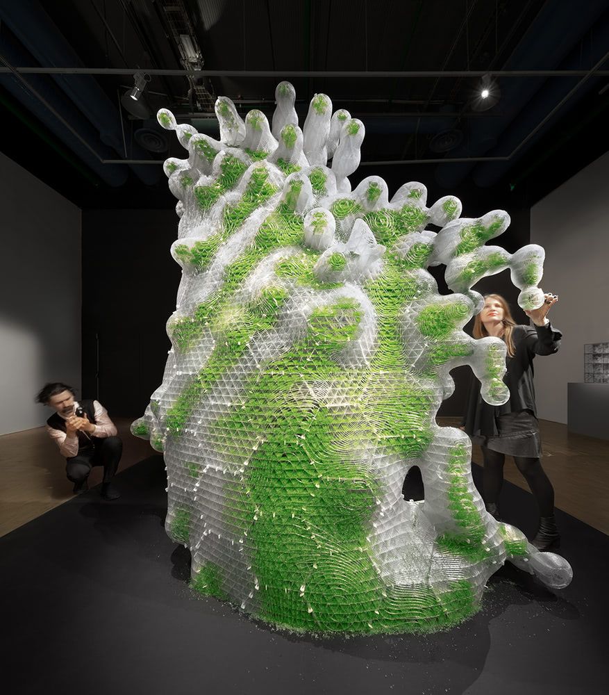 The momentous expo includes ecoLogicStudio’s “in-human” garden, H.O.R.T.U.S XL, where visitors can witness a productive meeting of biological autonomy and man-made creation. Within the installation, technology and nature find balance; the sculpture's 3D printed structure optimizes the growth of the algae inoculated into it by humans, and in turn, the algae purifies the air that surrounds it, making this living sculpture receptive to both human and non-human life. The project grapples with how developments in synthetic biology and design give the notion of "living" a new artificiality.