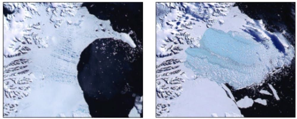 Ice shelves act as door stops, supporting the huge mass of ice further inland. Their removal means the glaciers feeding the ice shelf are no longer held back and flow faster into the ocean, contributing to sea-level rise.