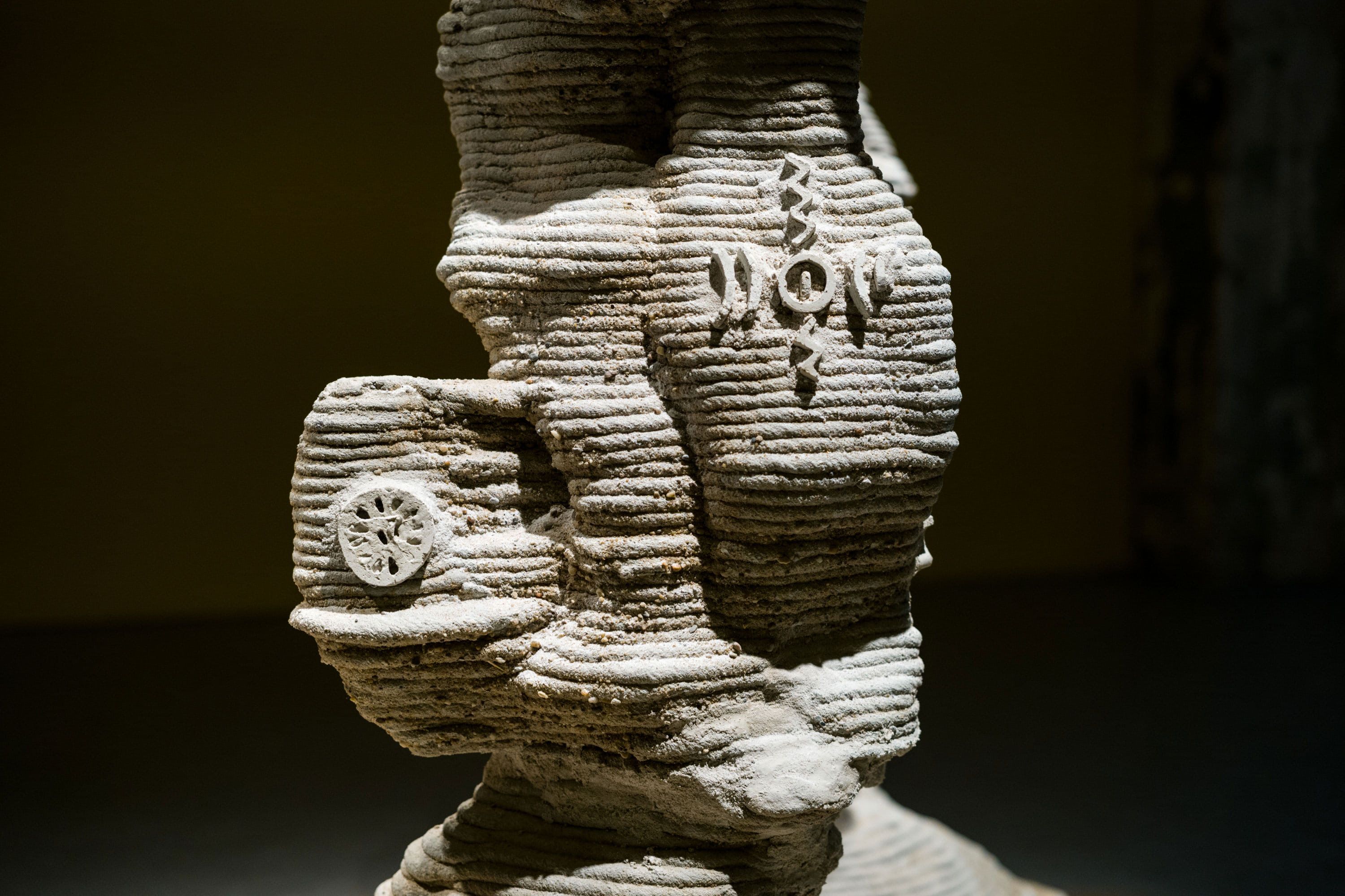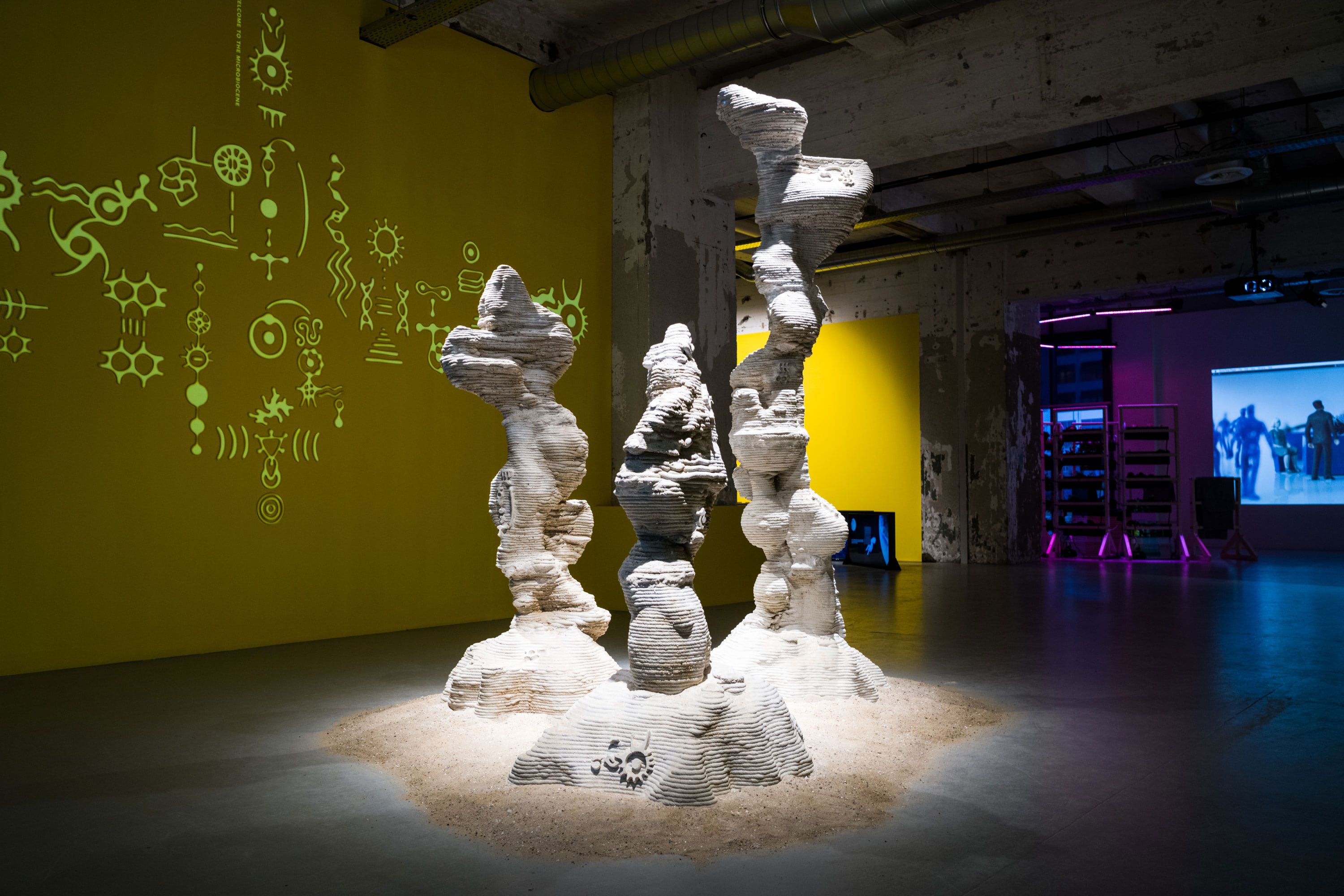 Inspired by the aspect of deep time, the installation envisions a future archaeological site, thousands of years into the future, where the Microbiocene monument is being found. It is inscribed with myths of the Microbiocene, a (re)telling of history and future on Earth as microbe-centric. These stories were based on information we unearthed from microbial fossils in sea sediment dating from the present to nearly 10,000 years ago. We then developed this data into narratives with our collaborating scientists, projecting different future scenarios.