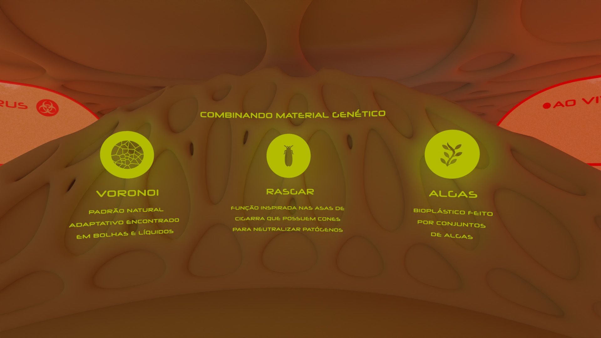 In the development process, a technological surface was speculated by the biomimicry methodology, present in the cicadas’ wings with the Voronoi pattern and the bioplastic made of algae to be applied in a pair of gloves, a car seat and a veil. The story introduces the speculated technology, the company and the field of biodesign, and within interactive space, developed to represent the laboratory of the future in which the visitors should extract the technology to complete their mission. As a result, we created a video simulation of the digital space that can be viewed through virtual reality glasses (VR).