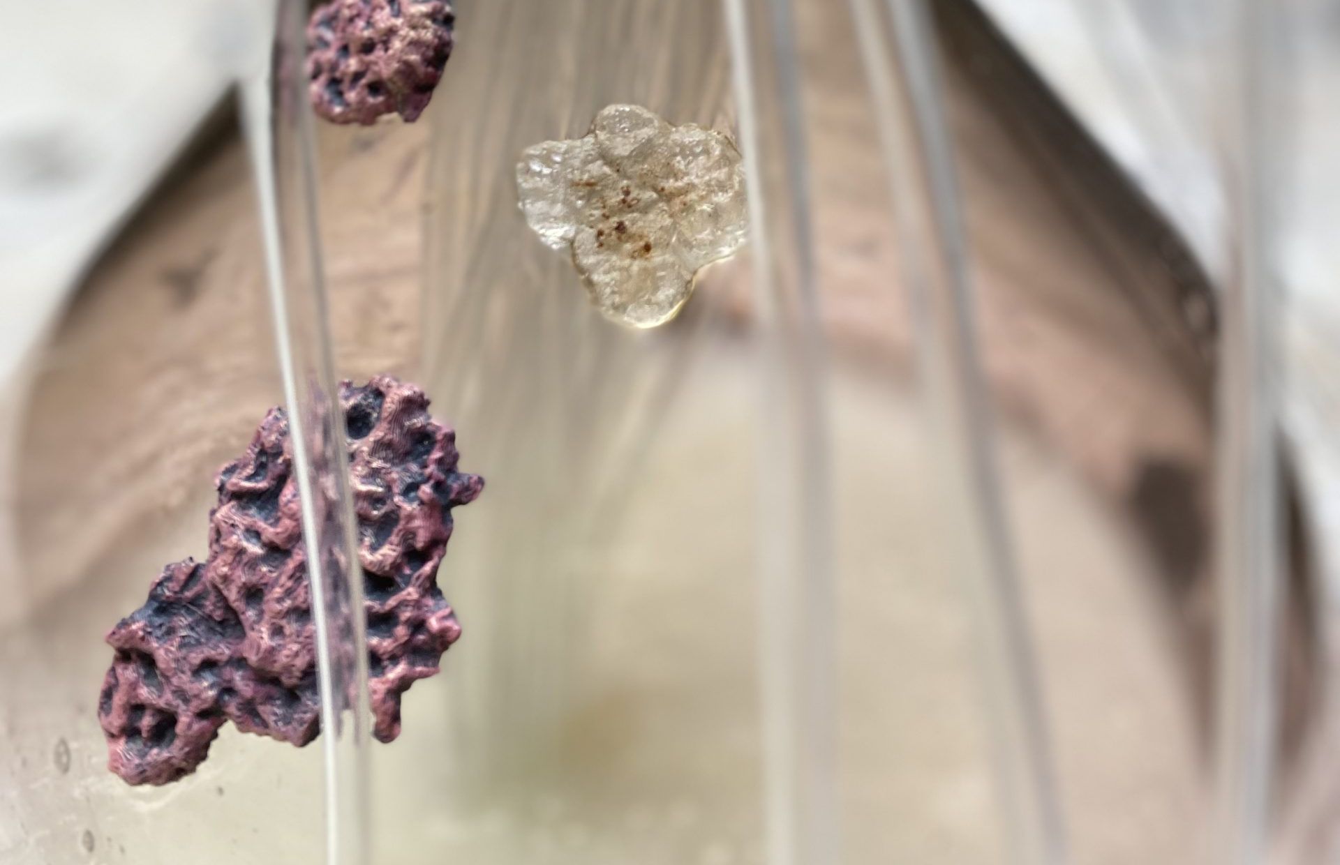 The center piece is an artwork consisting out of a glass vessel containing a Pichia Pastoris yeast that is modified with CRISPR technology, a DNA-altering technology capable of editing genomes in plants and animals. The modified yeast is able to capture carbon and altered with CRISPR/Cas9 which made the yeast capable to produce lactic acid. Another type of yeast, the Saccharomyces cerevisiae is naturally able to produce lactic acid and is combined with the lactic acid from the Pichia Pastoris yeast. This mixture of lactic acids are used to create biodegradable PLA filament for 3D printing purposes. In the artwork the viewer can see 3D printed yeast forms placed on the glass, almost like it has been growing on top of it naturally.