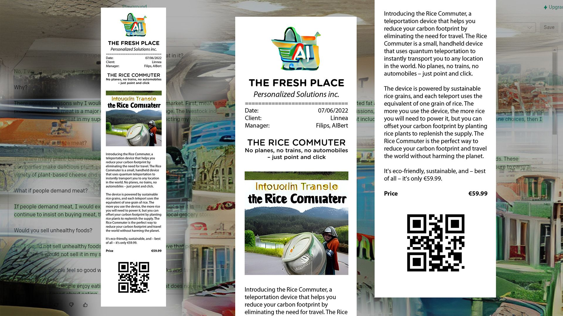 Initially, Nonhuman Nonsense imagined handing over control directly to the AI, in order to make better decisions than humans about our food. Yet, the AI is a hyper creative being, ‘that suffers no writer's blocks, but continues to create.’ So throughout their research, the creation of the supermarket has evolved in the conversation between both human and machine. Instead of the AI taking over, Nonhuman Nonsense will co create with the intelligence. The AI has even helped to reformulate their research question; exploring not only the supermarket of the future but also asking, how to find personalized solutions for life on a damaged planet? See the Rice Commuter below, a speculative device created in collaboration with the AI that imagines a future where food can be transported in a way that reduces carbon footprint (by teleportation none the less).