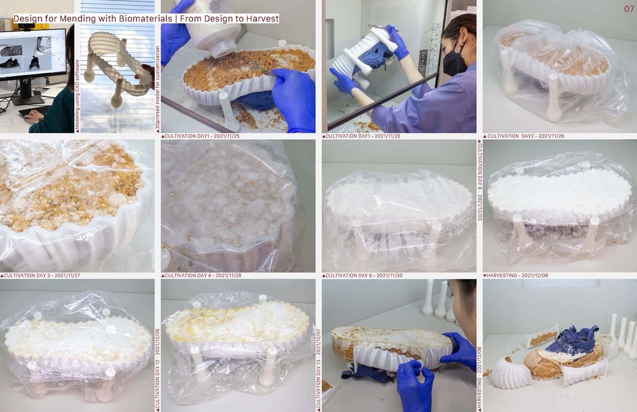 What if we mend our shoes together with mycelium? What will it mean to care for our belongings? How will our lifestyle change if we invite mycelium into the practice of mending as a daily practice? The project “Mending with Mycelium” explores these questions through material research on the possibility of mycelium as a material for and partner in mending, and a near-future scenario based in Kyoto, Japan about a Kinji-ya or co-mender, a professional who mends shoes in collaboration with mycelium.