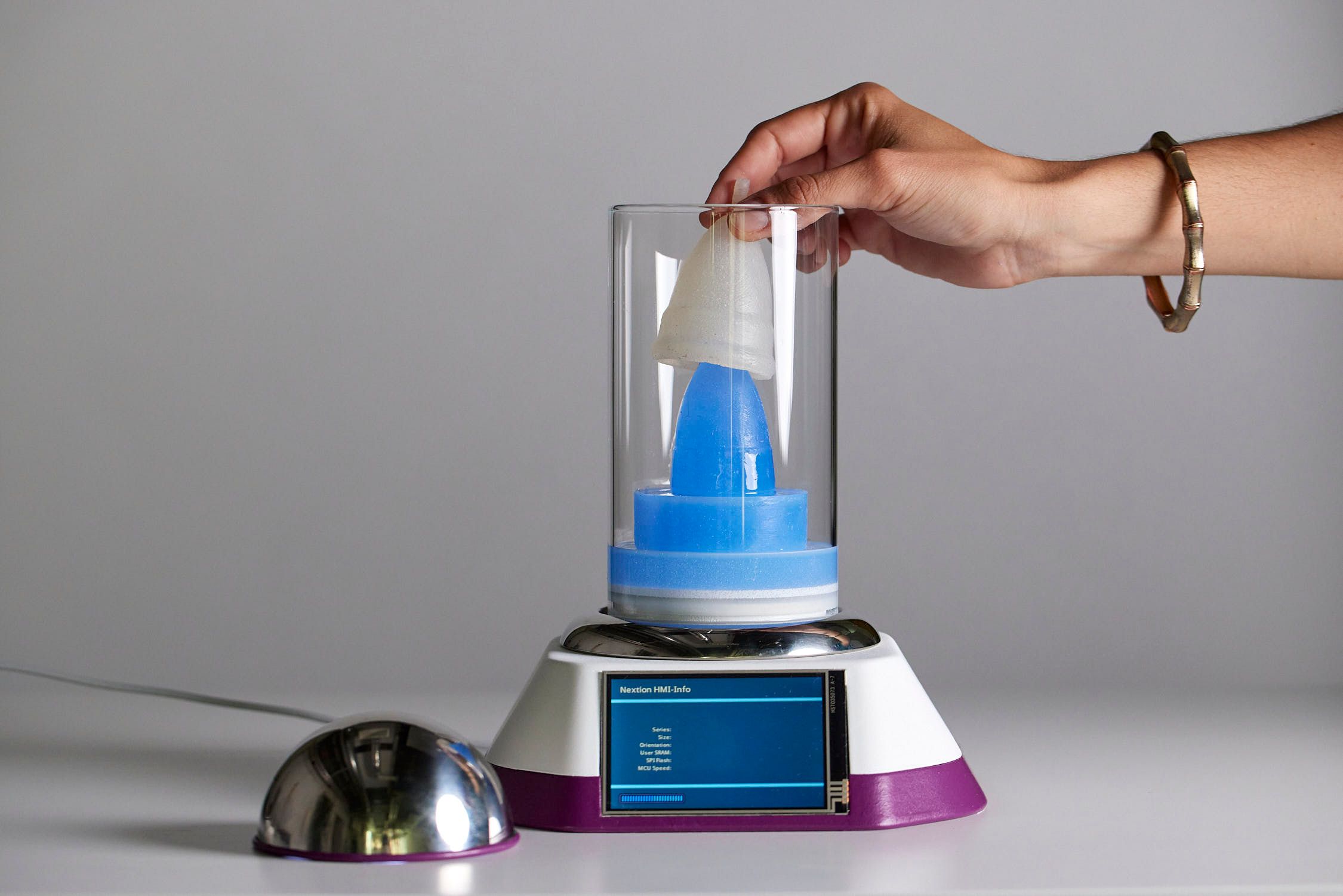 The Soothing Cup explores a speculative future where menstruators are deeply attached to their menstrual cups, establishing a mutualistic relationship as an alternative to chemically preventing periods. The development of an alginate-based hydrogel allows the cup to become a membrane able to interact with the vaginal environment. Thanks to an incubator that acts as a surrogate vagina, people who menstruate can cultivate their own anti-inflammatory bacteria and let them colonize their cups. When off-menses, the user can take care of the cup whilst increasing knowledge and challenging the stigma around periods.