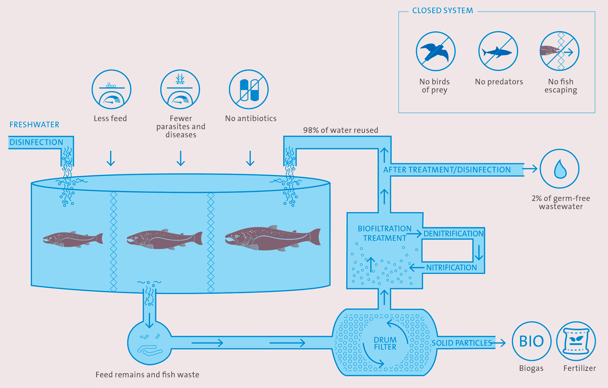 A bluehouse is a fish farm that raises fish or aquatic plants in tanks and ponds on land, instead of the oceans. Fish are cultivated in a controlled atmosphere which enables farmers to carefully monitor environmental factors such as water quality and weather conditions. Since seasonal factors are becoming insignificant, different types of seafood can now be available all year-round. The usage of closed-loop systems is also worth mentioning: fish waste serves as a valuable nutrient source for plants while the plants help purify the water in return. Last but not least, land-based fish farming allows farmers to raise fish locally, reducing transportation emissions.