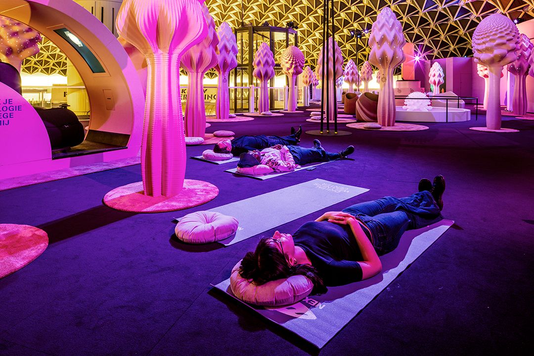 The Breathing Session at the Digital Wellness Center in the Next Nature Museum was created by artist Geoffrey Lillemon. It’s an artistic meditation session where the body and environment merge through sound, visuals, space and light. Breathing aligns with the rhythm of the music, resonating with the architecture through light and color.