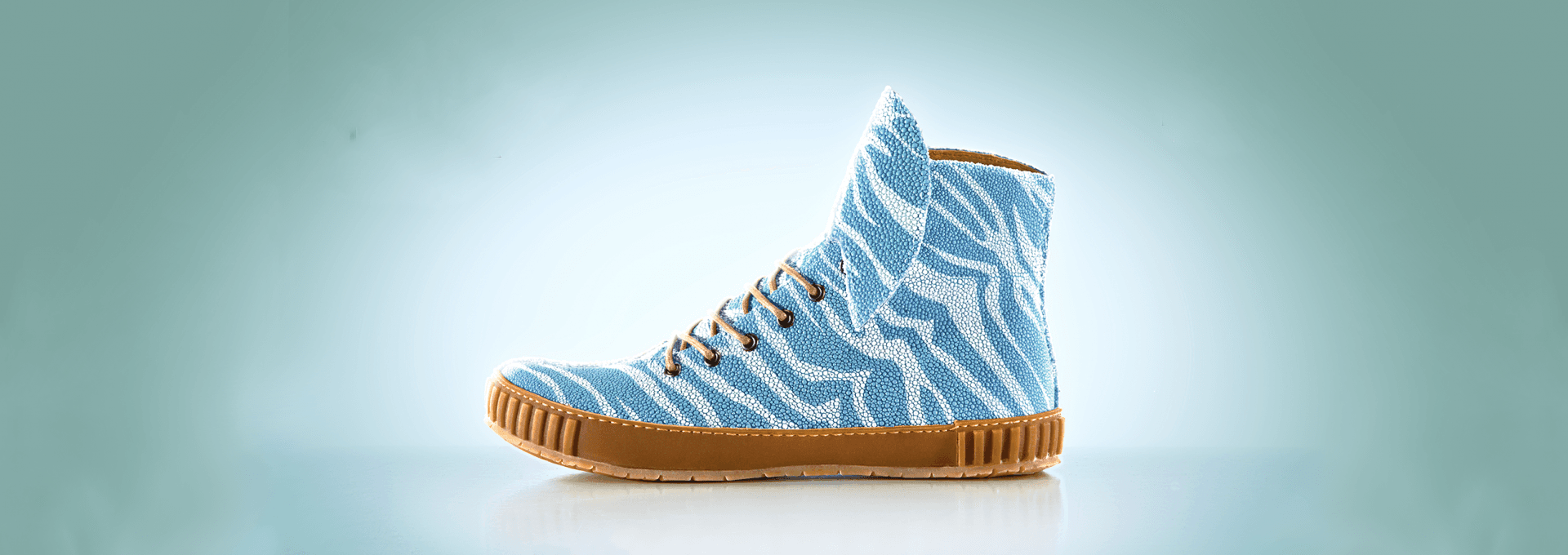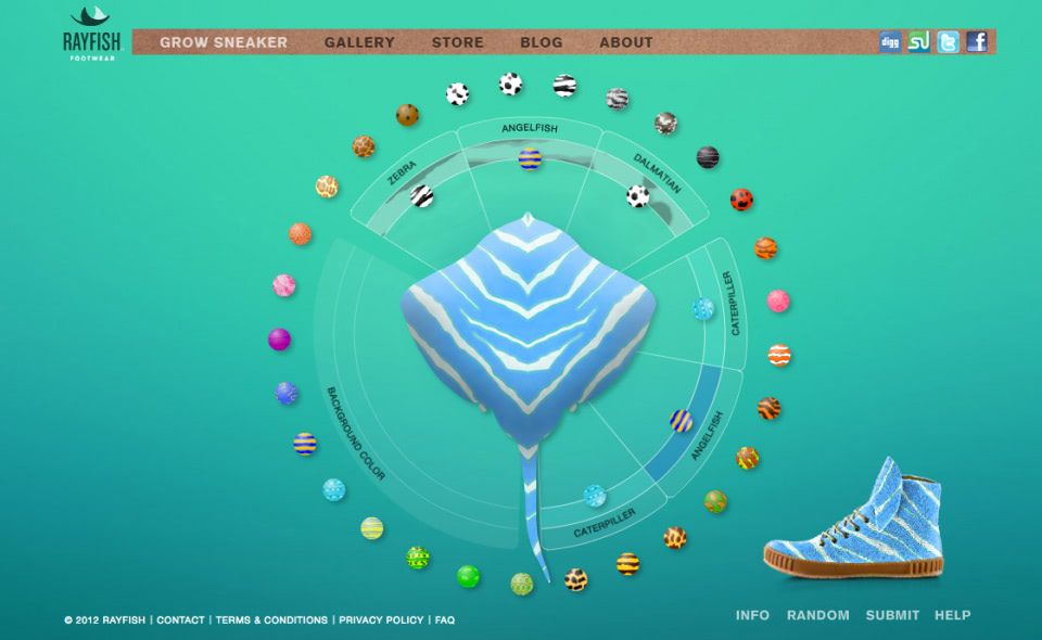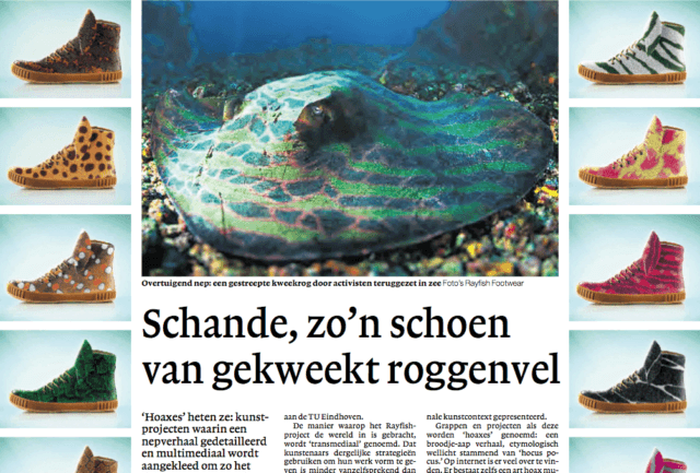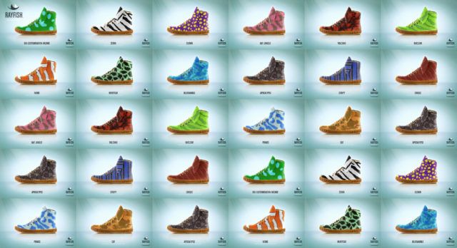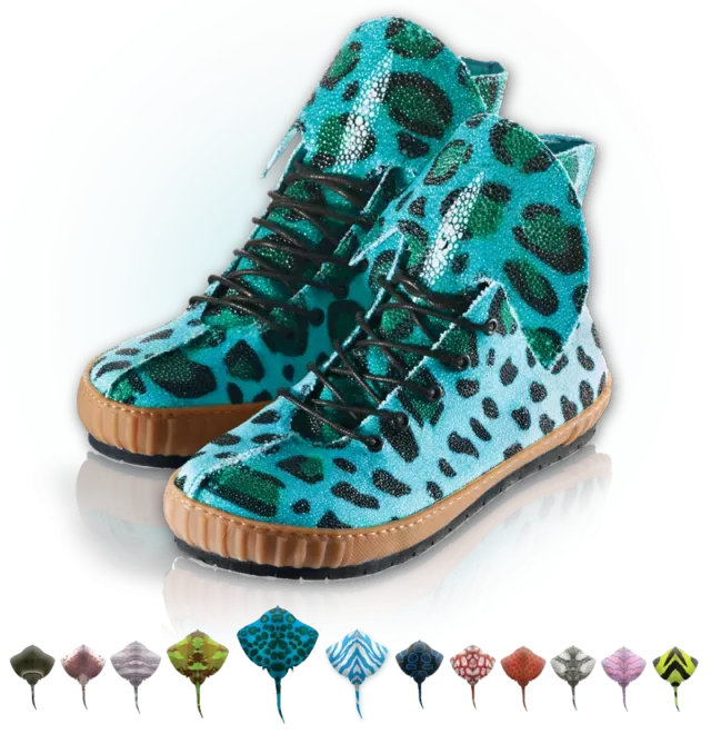 Visitors of the Rayfish website could grow their own sneaker with the online design tool. The best designs would win their shoe. In reality seven highly exclusive stingray leather sneaker prototypes were created in collaboration with Dutch Shoe designer Jan Jansen. The stingray skins were provided by Roje Exotic Leather. The leather of the shoes has not genetically modified, but dyed with paint.