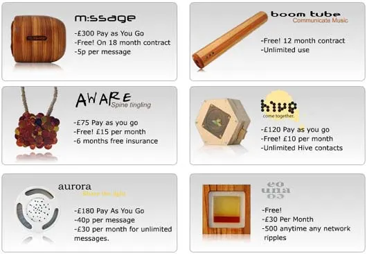 Telecom shops already seem to be growing phones in infinite variations. Nonetheless, students of the University of Dundee managed to find an original twist by creating a series of extremely specialized phones that communicate music, communicate nearness, or give you a massage when you get a message. I especially like the 'tribal' design of the series of devices. Although the wood style is somewhat illustrative, it is well chosen to provoke a debate about the tribal communication technology penetrating our everyday lives.