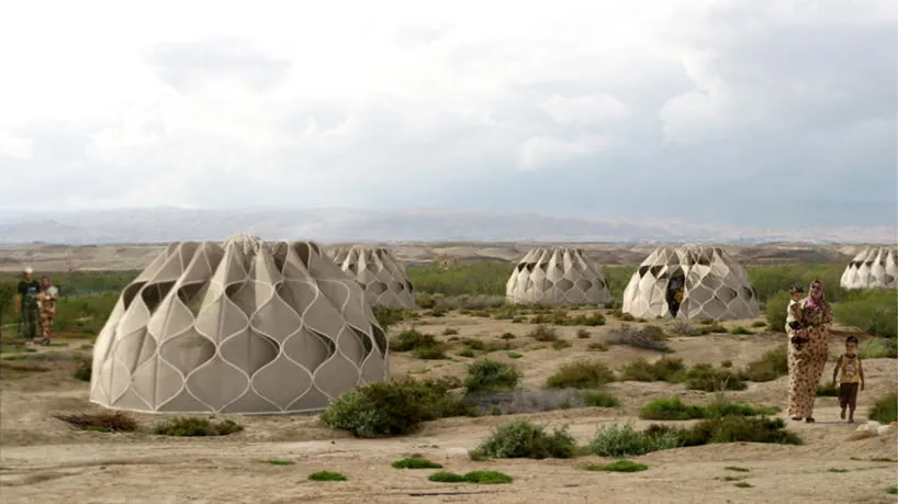 Inspired by temporary huts of nomadic tribes, designer Abeer Seikaly created a disaster shelter for refugees using patterned fabric. The project, called Weaving a Home, is based on ancient traditions of intertwining fibers and materials to make complex three-dimensional shapes for functional and social needs.