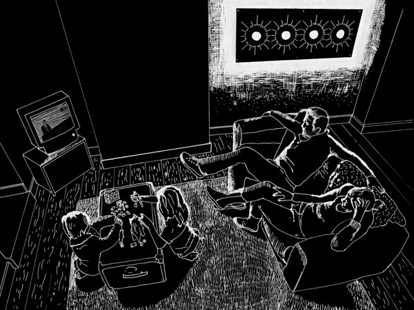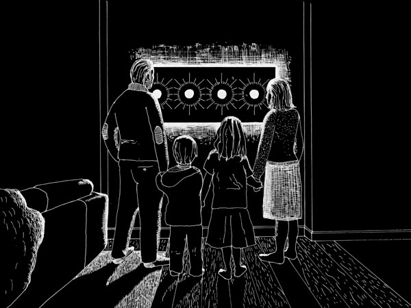 We zaten allemaal in de woonkamer, zoals elke avond. Sandra en ik keken naar een of andere nietszeggende documentaire en de kinderen speelden met hun lego. Het moment overviel ons. Paul was de eerste die de ongewone gloed van Happylife opmerkte. Het bleef helderder worden – een geleidelijke, nauwelijks opvallende opbouw van intensiteit totdat we weg moesten kijken.