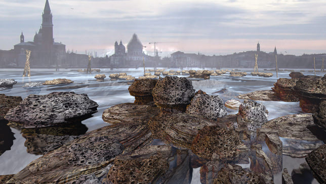 Protocell technology technology could stop the city of Venice from sinking on its soft geological foundations by generating a sustainable, artificial reef under its foundations. Computer renderings by Christian Kerrigan.