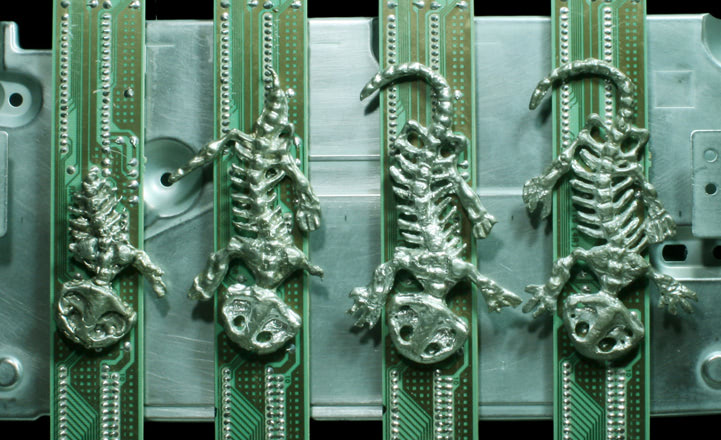 Kunstenaar José E. Rivera vindt plezier in het beeldhouwen van dieren uit elektronische infrastructuur. Dezelfde kunstenaar die de evoluerende muis heeft gemaakt. We weten niet goed wat we moeten concluderen uit het feit dat deze blikken luipaarden allemaal fossielen zijn. Technobionostalgie?