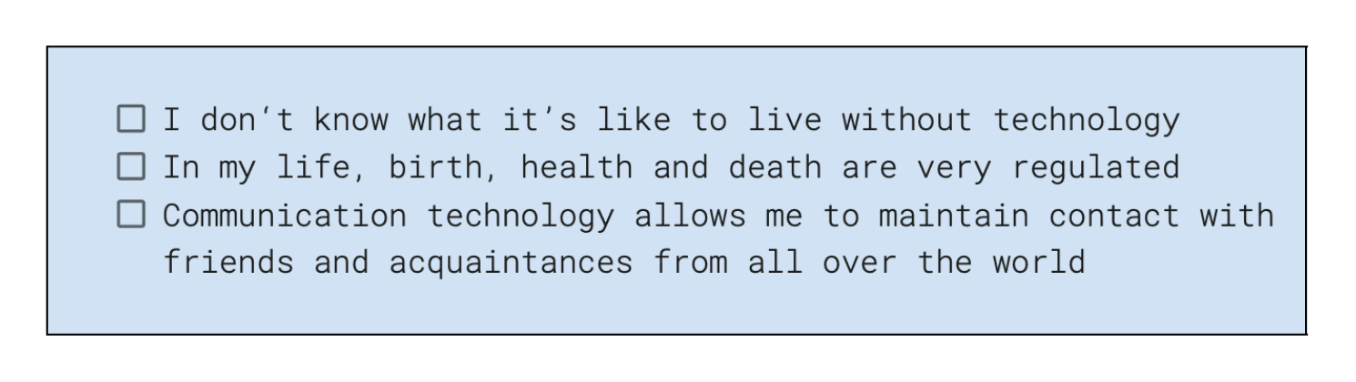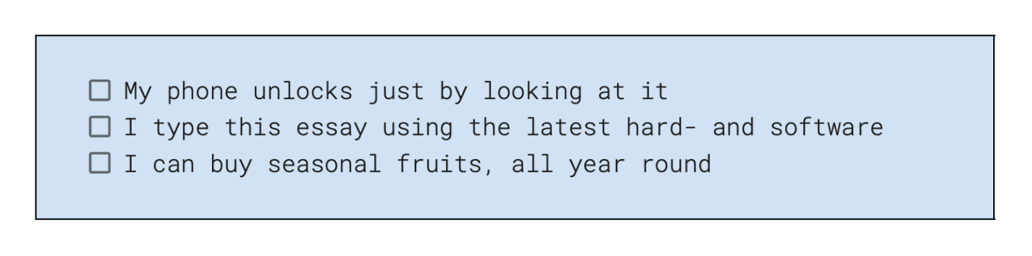 Bewustzijn ontstaat niet zomaar van de ene op de andere dag, en het proces van bewust worden is nooit afgerond. Dus wat ik hier voorstel, kan een behoorlijk grote en abstracte taak zijn. Een eenvoudige en concrete manier om te beginnen is echter door ons eigen technologische privilege te erkennen. Opnieuw haal ik inspiratie uit Peggy McIntosh. Een deel van haar essay is een checklist met uitspraken die de effecten van wit privilege in haar eigen dagelijks leven codificeren. Bijvoorbeeld: ‘Ik kan pleister of verband in “huidskleur” kiezen en deze zal min of meer bij mijn huid passen’, ‘Ik kan de televisie aanzetten of de voorpagina van de krant openslaan en mensen van mijn ras breed vertegenwoordigd zien’, of ‘Wanneer mij wordt verteld over ons nationaal erfgoed of over “beschaving”, wordt mij getoond dat mensen van mijn huidskleur dit hebben gemaakt zoals het is’. Geïnspireerd door deze lijst, begin ik mijn persoonlijke checklist van technologisch privilege te creëren. Het bestaat uit een lijst van technologische privileges waar ik dagelijks op kan ‘rekenen’, om met McIntosh te spreken.