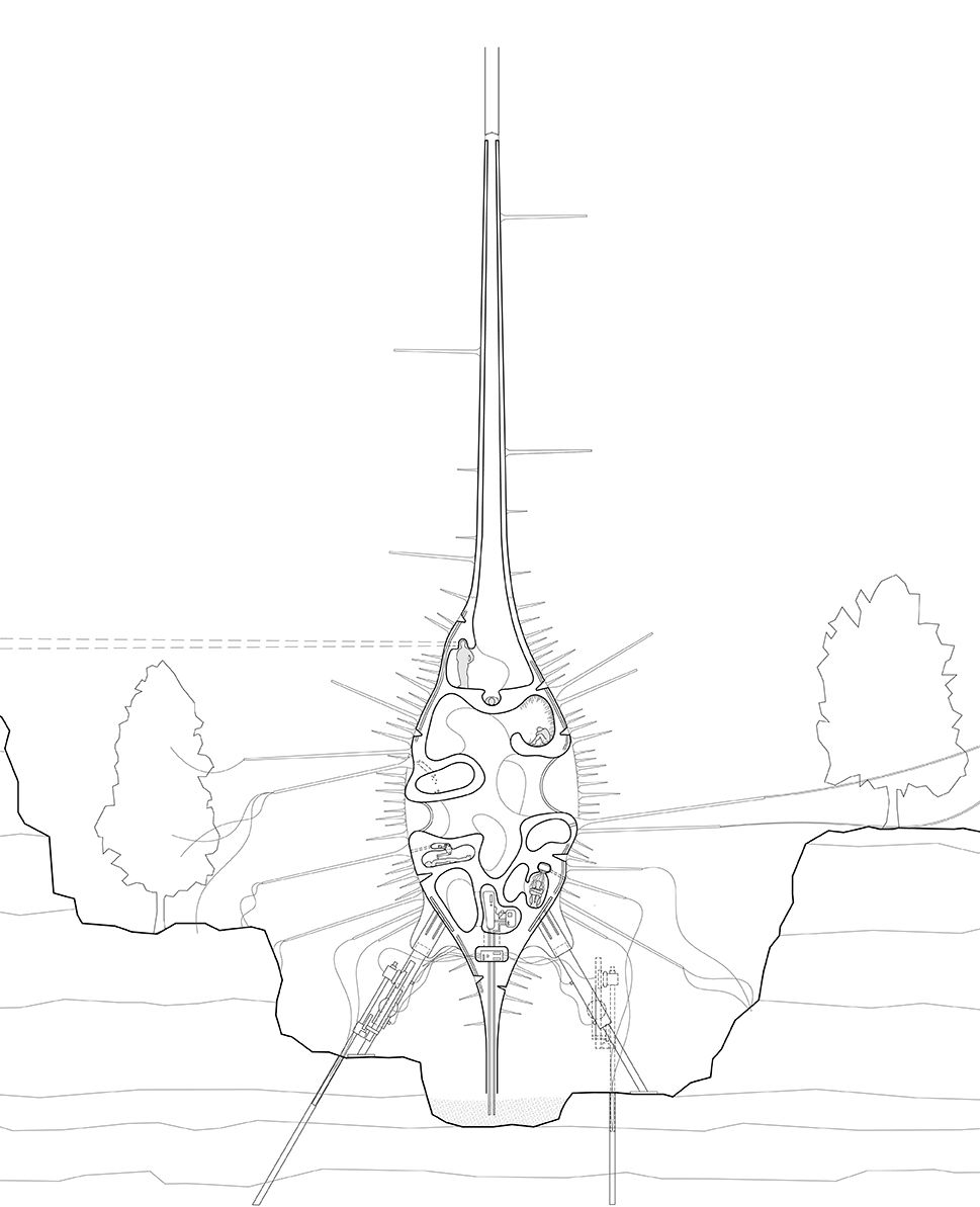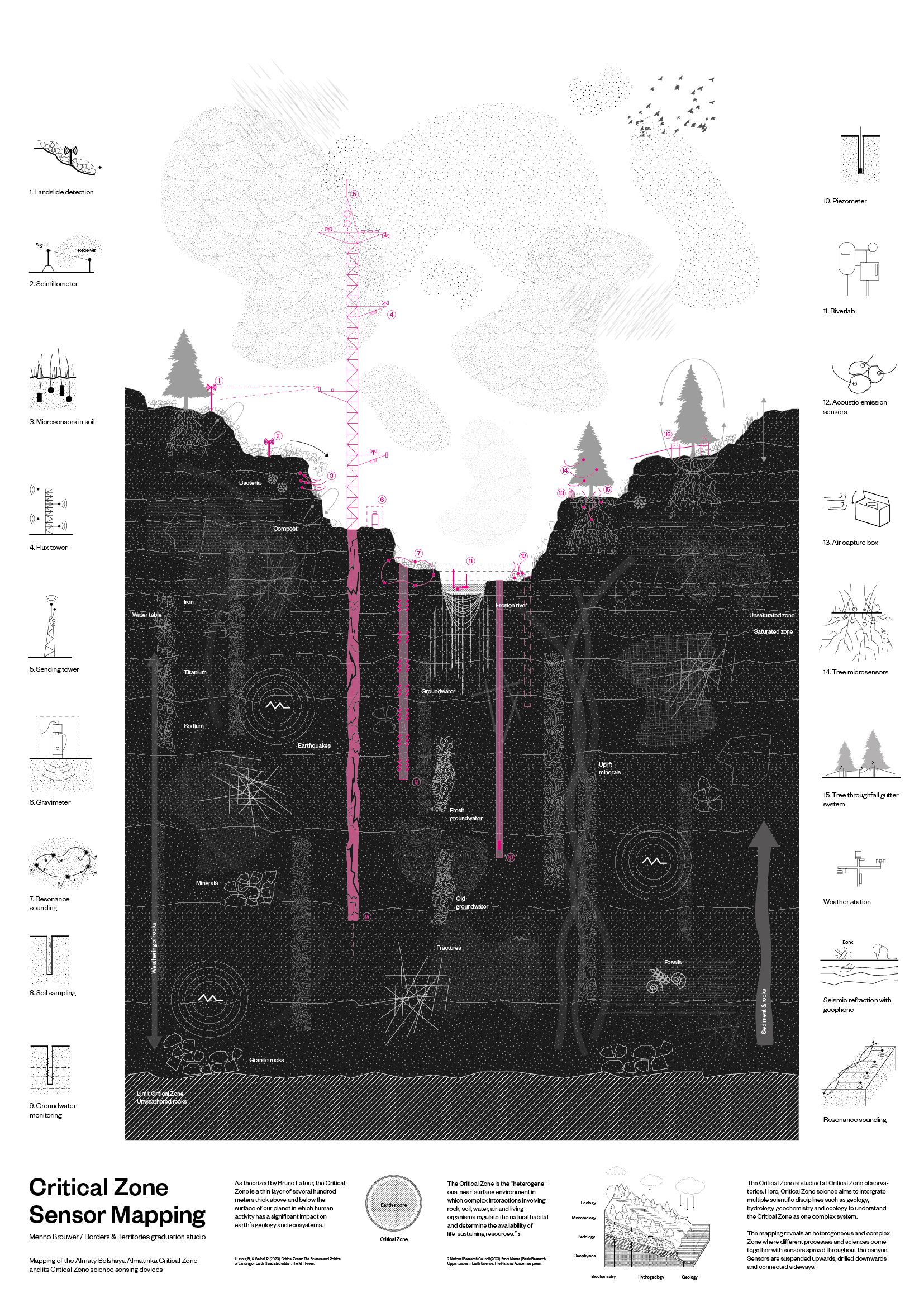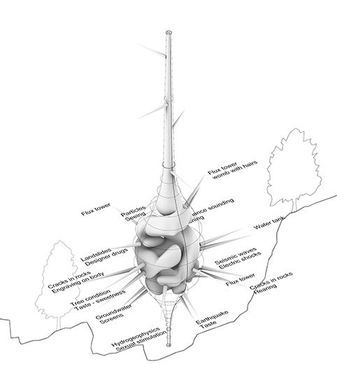 Als architect is mijn creatieve proces voornamelijk onderzoeksgebaseerd; contextueel, filosofisch, programmatisch, ecologisch en architectonisch. Door onderzoek te doen naar deze bepaalde thema's streef ik ernaar bepaalde problemen, kansen of omstandigheden te synthetiseren die via een architectonisch project aangepakt kunnen worden. In het geval van dit project zag ik een kans in de opkomende praktijk van Critical Zone Science. Critical Zone Science streeft ernaar meerdere wetenschappelijke disciplines zoals geologie, hydrologie en ecologie te integreren om een stuk aarde of natuur te begrijpen als een heterogeen en complex systeem, in plaats van een gefragmenteerde samenstelling. In wezen om de onderling verbonden en complexe details van onze omgeving beter te begrijpen. Het project biedt een infrastructuur en combineert de meetapparatuur die wordt gebruikt voor Critical Zone Science, en vormt in feite een observatorium voor deze opkomende wetenschappelijke beweging.