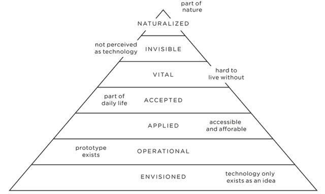 Sommige technologieën worden sneller geïntroduceerd, geaccepteerd en afgedankt dan andere. Next Nature heeft de Technologiepiramide ontwikkeld om te visualiseren hoe technologie in zeven stappen natuur wordt.