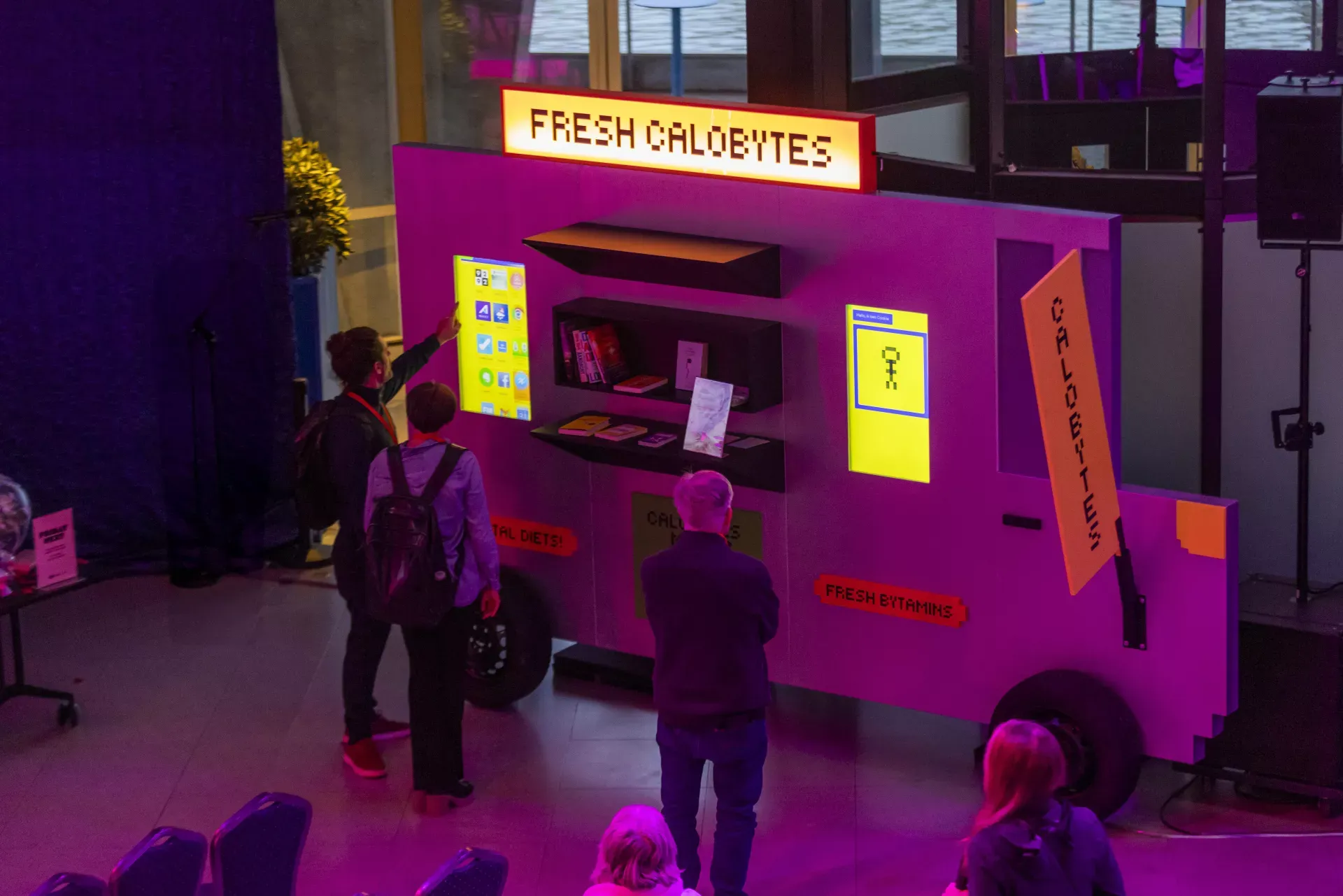 Bezoekers proeven kweekvlees-ijs, kiezen speculatieve gerechten en laten een persoonlijke videoboodschap achter over hun visie op de toekomst van voeding.
