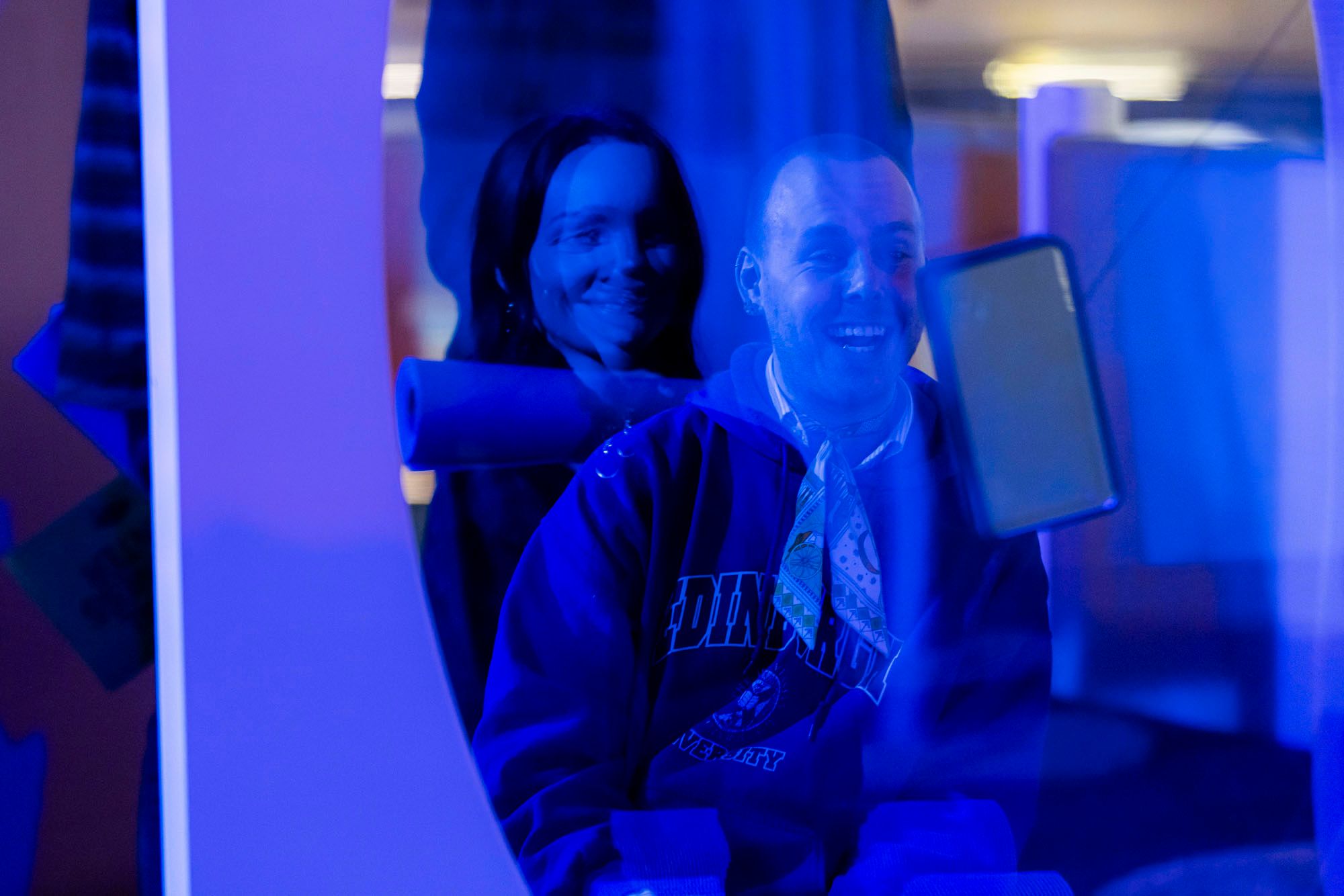 Dancing in the Frame brengt dit tot leven. Stap in een levensgrote telefoon en ervaar zelf de beperking van het digitale kader. Sensoren in het frame registreren wanneer je buiten de randen beweegt en geven een signaal. Zo ontdek je hoe je vrijheid wordt begrensd door het scherm—zelfs wanneer je denkt vrij te zijn.