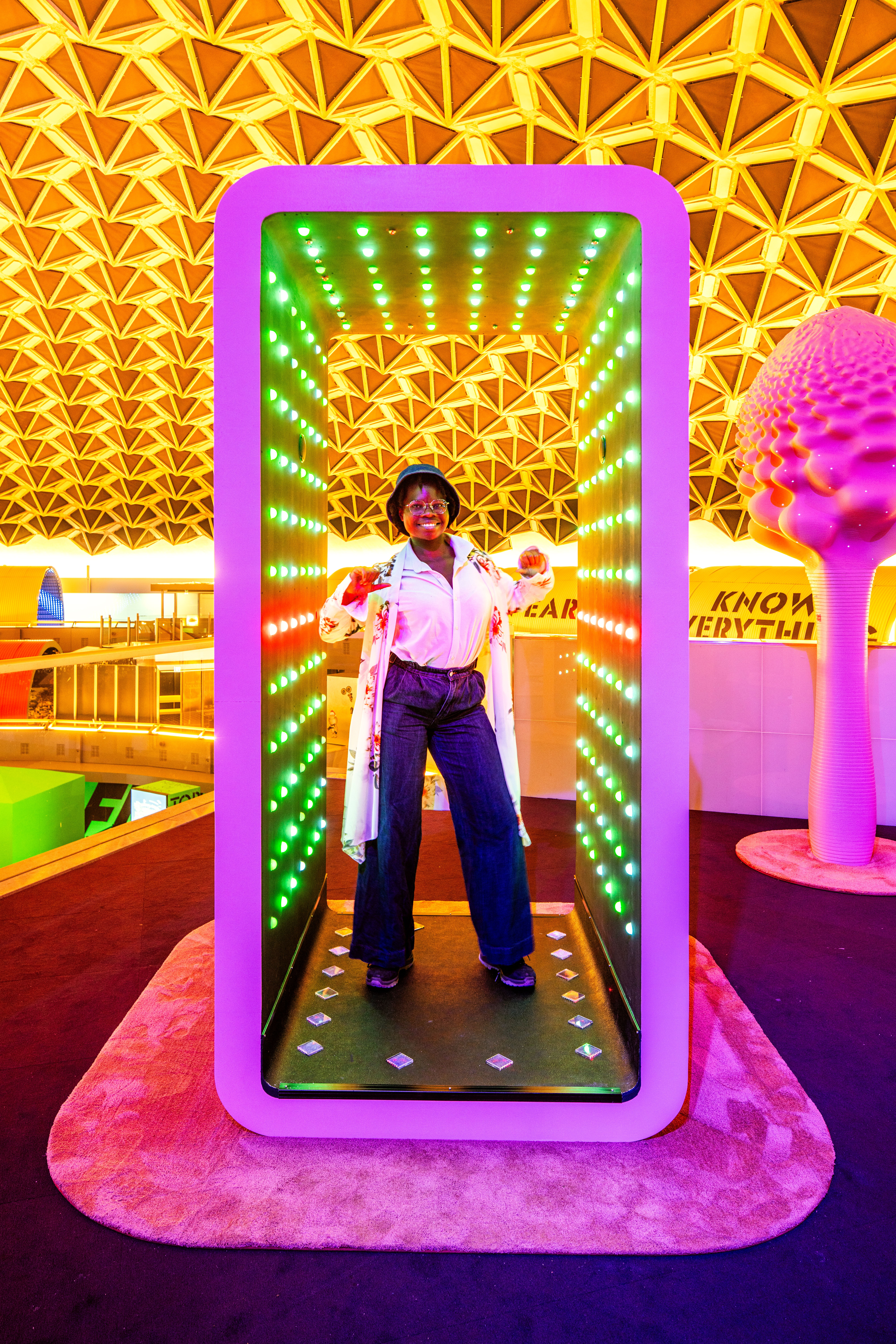 Het kleurrijke bos ademt letterlijk met je mee. Elke half uur begint er een ademhalingssessie, gecreëerd door kunstenaar Geoffrey Lillemon, waarin geluid, visuals, ruimte en licht samenkomen om lichaam en omgeving te verbinden.