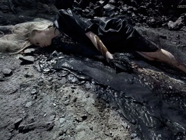 In response to the latest oil spill famed photographer Steven Meisel made a shoot for the Italian Vogue (the only fashion magazine in the world worth reading, really) that replaces the tragically accustomed oil-soaked birds with a top model Kristen McMenamy withering away wearing black feathered outfits. Poor girls birds.