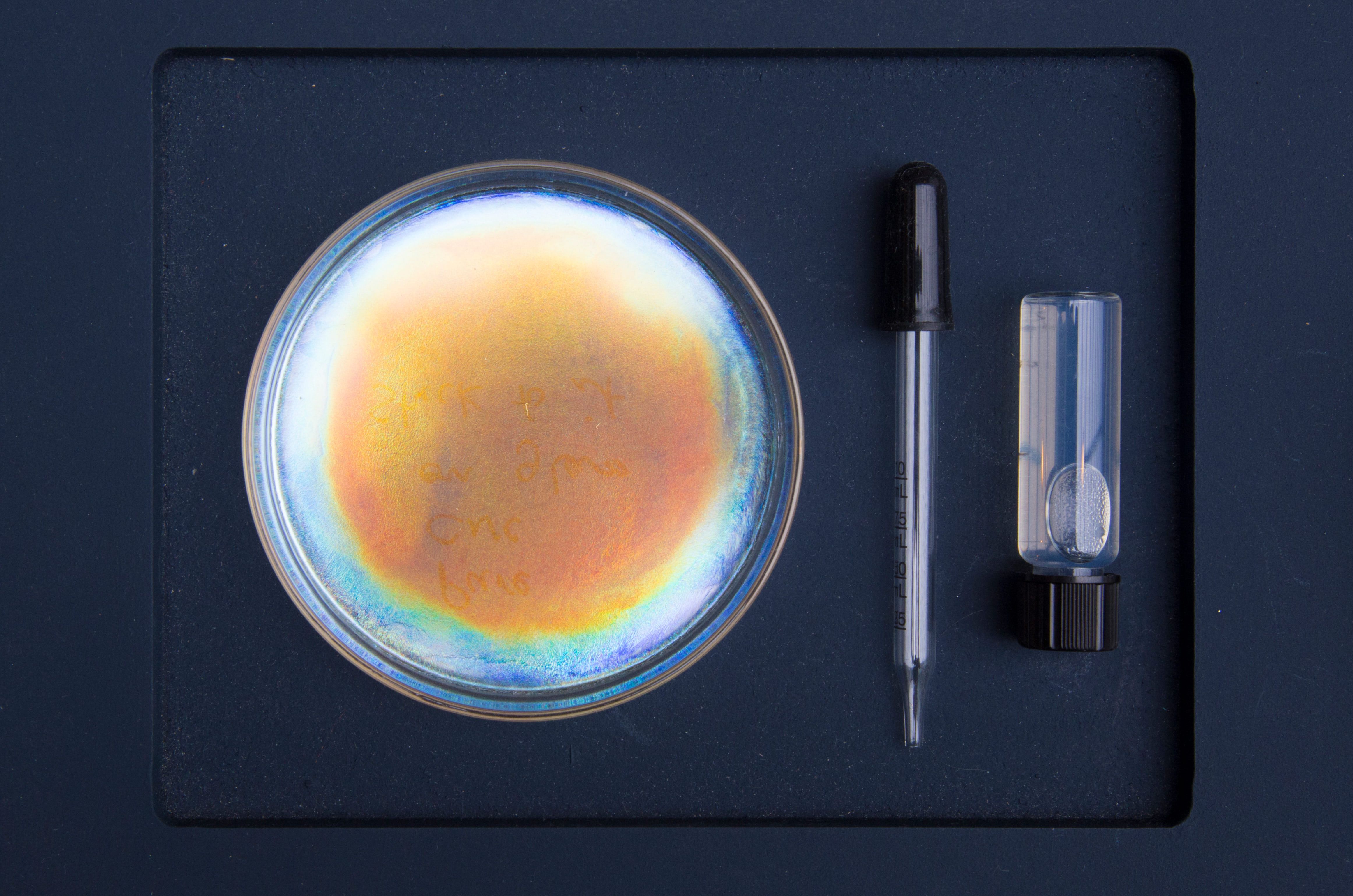 So, how to resolve the conflict of attaining nature’s beauty without harming it? For Brunato, “nature provided the clues.” The designer is inspired by how the nonhuman world is “abundant with examples that demonstrate the dazzling optics of structural colour.” Indeed, pollia berries, bacteria strains and beetle wings all gain their vivid colours from microscopically small nano-structures that interfere with visible light.